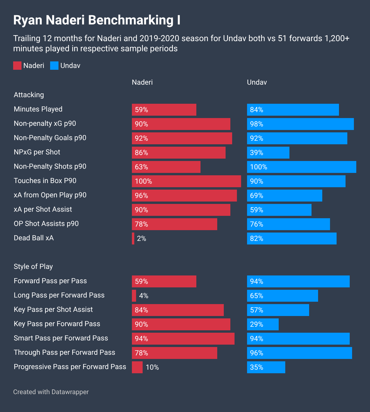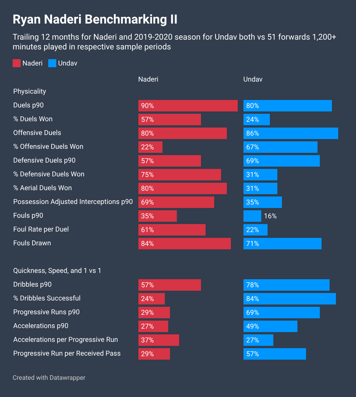 Here we see some profile and stylistic differences emerge between two players, with Undav more explosive runner and likely a better technical player on the ball, overall. Naderi appears a willing and capable on-ball defender, good in the air, and with additional markers for IQ via interceptions and foul rate metrics above average.