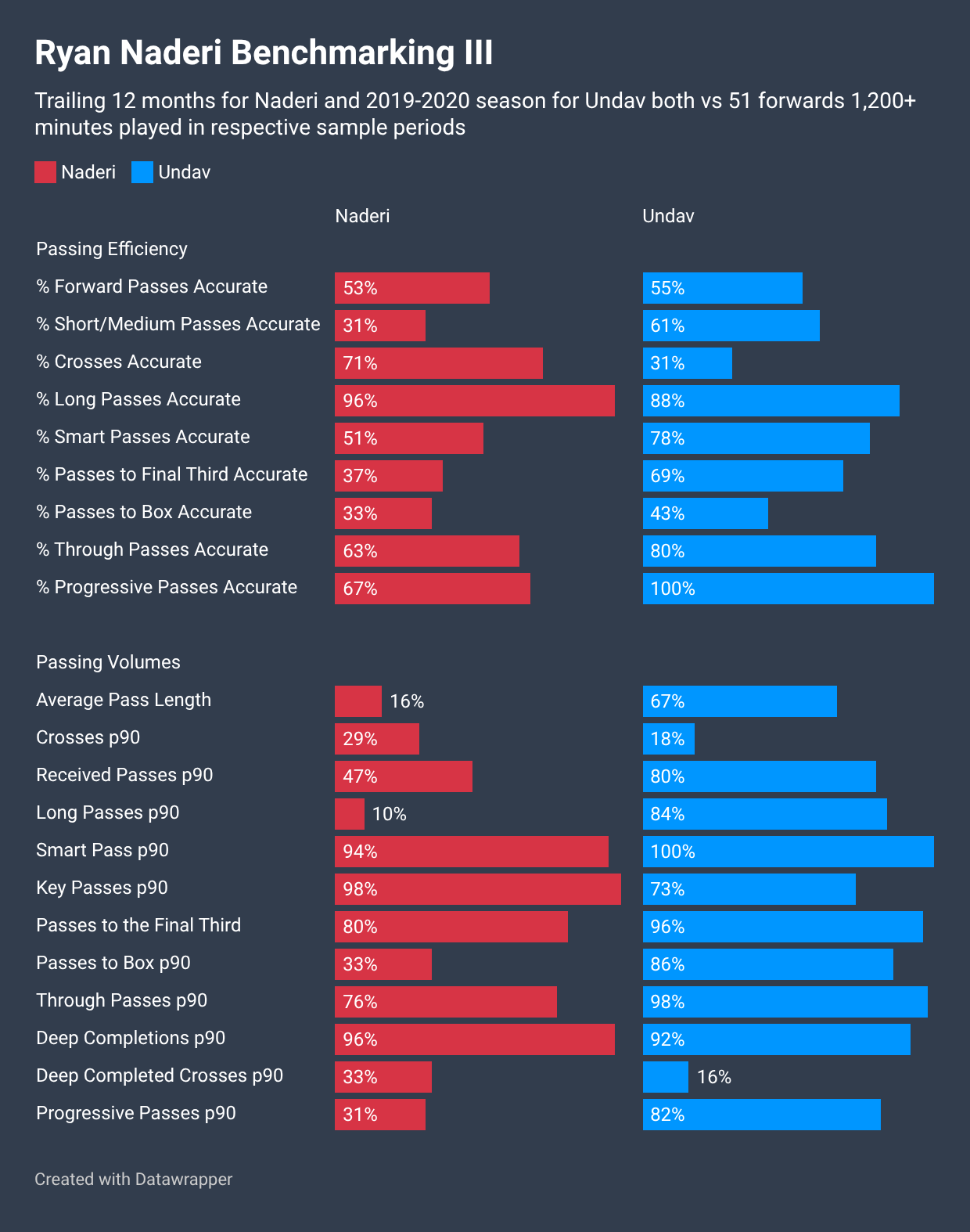 Red flags are useful in serving as catalysts for additional inquiry, and in Naderi’s case, technical ability is probably not a relative strength, though not a big weakness either. I think his lower efficiency rankings are more to do with his passing mix - i.e. he takes a LOT of risks, as reflected in his volume rankings for deep completions, through passes, key passes, and smart passes. Combined with his metrics in the first image above, I suspect his risk/reward profile lands favorably on the “reward” side of the ledger.