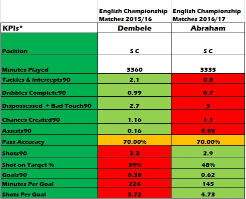 Essentially, when we consider goals, Abraham comes out on top across the board. In fact, Dembele attempted even more shots per game that this season. Abraham manages his goals at a far more efficient rate. I don’t have comparative data for number of shots in and out the box for Dembele last year.