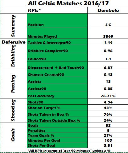 Overall, the notion that we have one of the top young strikers in Europe playing for Celtic is borne out by comparing him to his peers in more monied leagues. From a coaching perspective, Dembele can improve on: