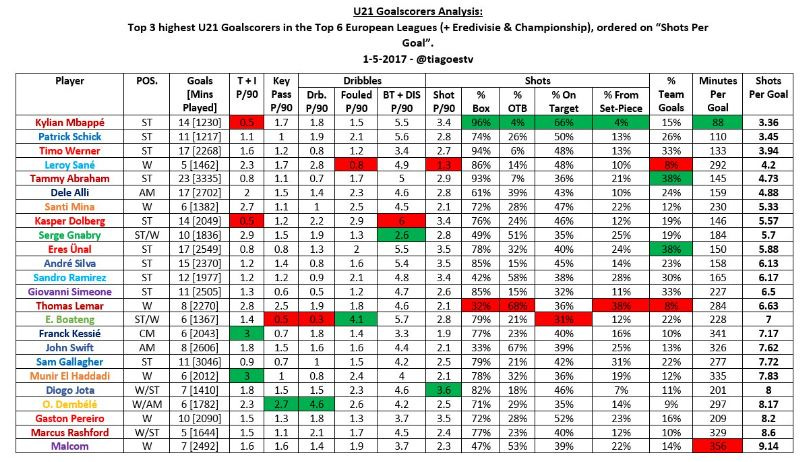 I revisited the comparison of Celtic wide attackers in Give Me More Wings. This analysis was refreshed thanks to Tiago Estêvão (please follow him on Twitter @TiagoEstv). Tiago has now come up with an analysis of the top 3 Under 21 goal scorers in each of the top 6 European Leagues (plus the Eredivise and English Championship). I reproduce it here:
