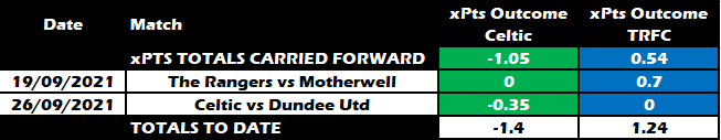 At the moment, based on xPts, Celtic have 1.4 less points than expected due to Honest Mistakes and The Rangers have 1.24 more points than expected.