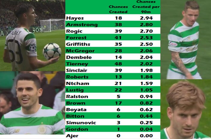 The two strikers lead the way, with the first creative midfielder in 4th spot – Rogic. Dembele has only played the equivalent of 6.88 full matches so it is a small sample.