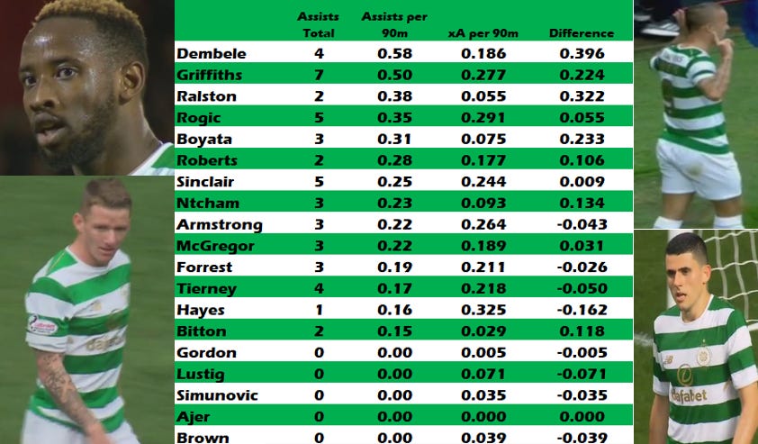 Both Dembele and Griffiths are out performing their xA whilst Rogic is performing much as expected. He has 5 assists in total.