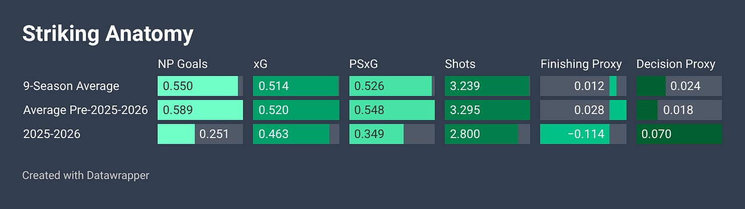 Given non-penalty xG for the team is down almost 17% versus last season, that 11% decline suggests that “getting onto the end of chances” has not been the major issue, overall. While not shown, xG per shot is actually up 4% versus the long-term average.