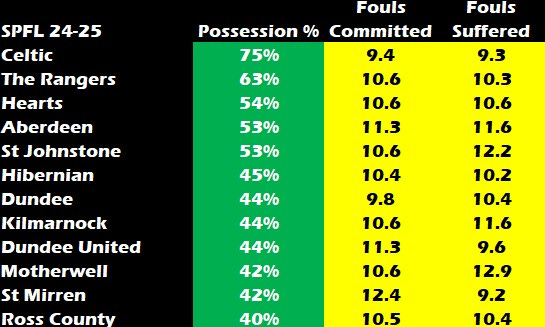 Meaning, we need to allow for the fact that, in common with trends between high and low possession sides and high and low pressing sides, Celtic will foul more frequently on a possession-adjusted basis.