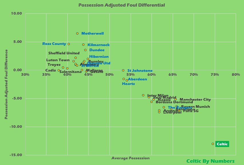 However, even allowing for Celtic’s outlier possession average of 75% (the next highest in the sample is 67%), can the differential in fouls be solely explained by playing style?
