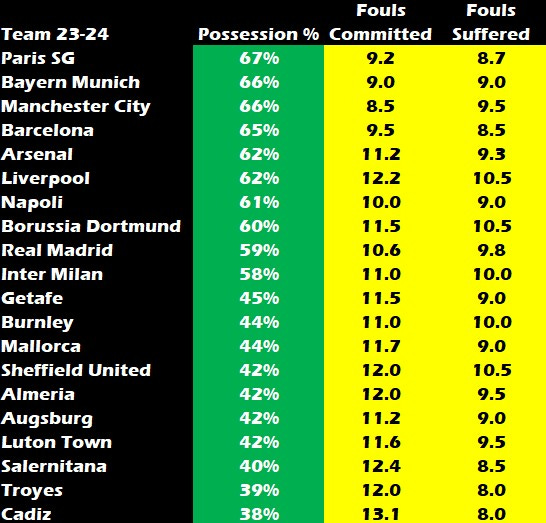 Here are 20 teams from the “top five” leagues from the 2023-24 season that are a sample of “high” and “low” possession teams and their foul rates for and against.