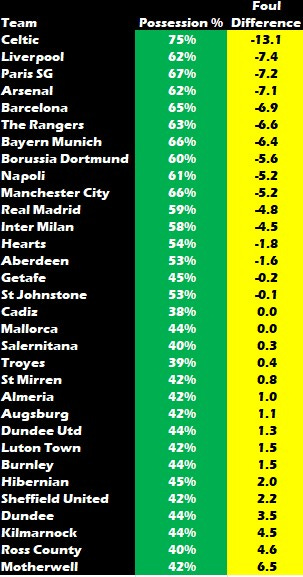 Celtic has around 12% more possession than the next highest possession side in this sample (Paris Saint-Germain). Yet, there was an 82% higher foul difference between the sides.