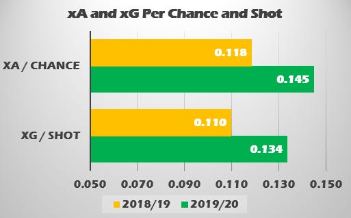 The chart above shows that both chance quality and shot quality have increased from last season.
