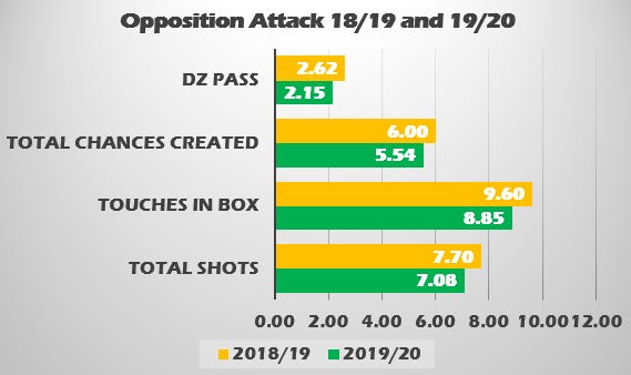 The opposition are having less shots (7.08 compared to 7.7 last season) and less touches in Celtic’s box (8.85 to 9.6). They are also creating less chances (5.54 to 6) with fewer passes into the Danger Zone.