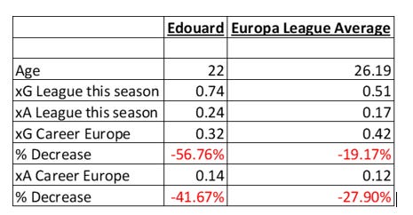 As great as Edouard has been this season in Scotland, his performance levels in Europe since arriving at Celtic have been relatively mediocre. I’ll be doing analysis by position groups over the next couple of weeks, which will compare our players to those from the other fifteen teams in our pot. Here is a quick preview relating to Edouard, specifically: