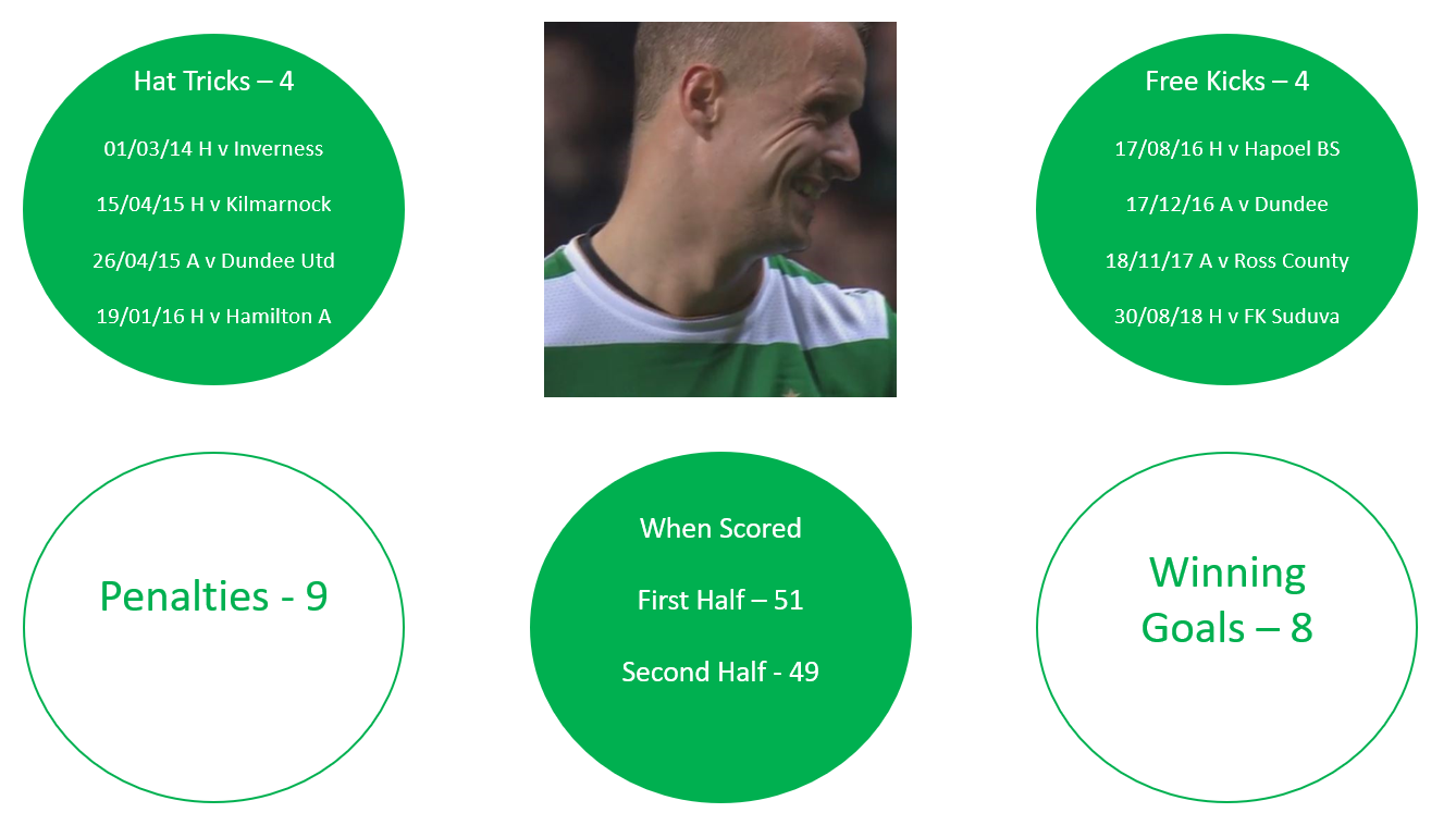 On 30th August Leigh Griffiths became the 29th Celt to score 100 goals. The 4th direct free kick of his Hoops career saw him join many Celtic greats like McGrory, Lennox, Larsson, Dalglish, Murdoch and more.