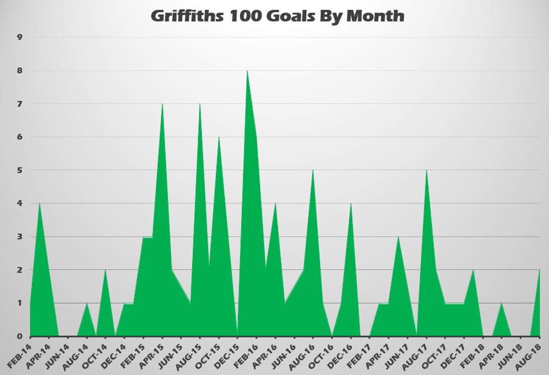 Griffiths has managed 20, 40 and 18 in his full completed seasons. He has only failed to score in 13 of the months Celtic have had matches since February 2014. His best tally was 8 in January 2016. From the initial goal versus Heart of Midlothian to the last goal versus FK Suduva, here is his productivity by month.