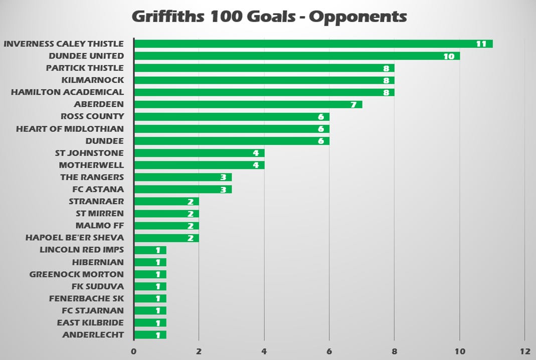 Griffiths scored in his second appearance for Celtic on 22nd February 2014, away to Heart of Midlothian in the SPFL. It was the first of 6 goals against The Jambos. But his most favoured opponent is Inverness Caledonian Thistle against whom he has racked up 11 goals.
