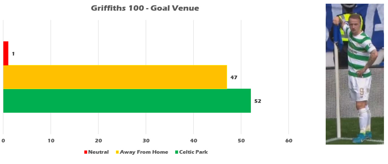 Griffiths is happy to score on any ground and has almost a 50/50 split between home and away goals. He has 1 goal at Hampden in a League Cup Semi Final versus The Rangers.