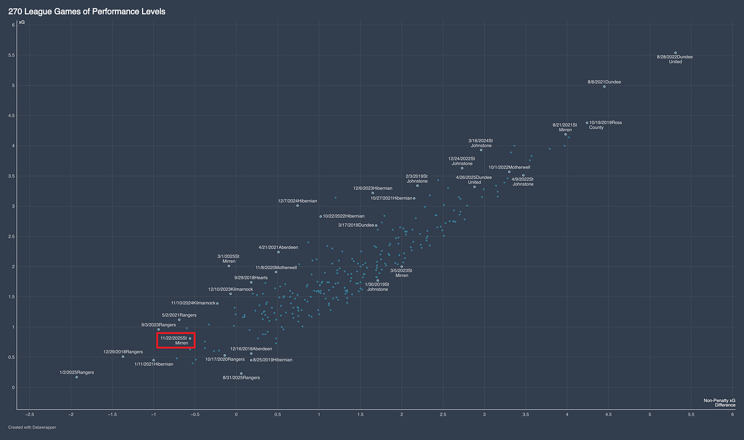 Through Saturday’s game, Celtic have had 270 league games since Rangers reached some semblance of financial relevance beginning with the 2018-2019 season. The image shows the xG for Celtic for each game on the vertical y-axis and the non-penalty xG difference on the horizontal x-axis. Needless to say, but these measures, Saturday in Paisley was no bueno.