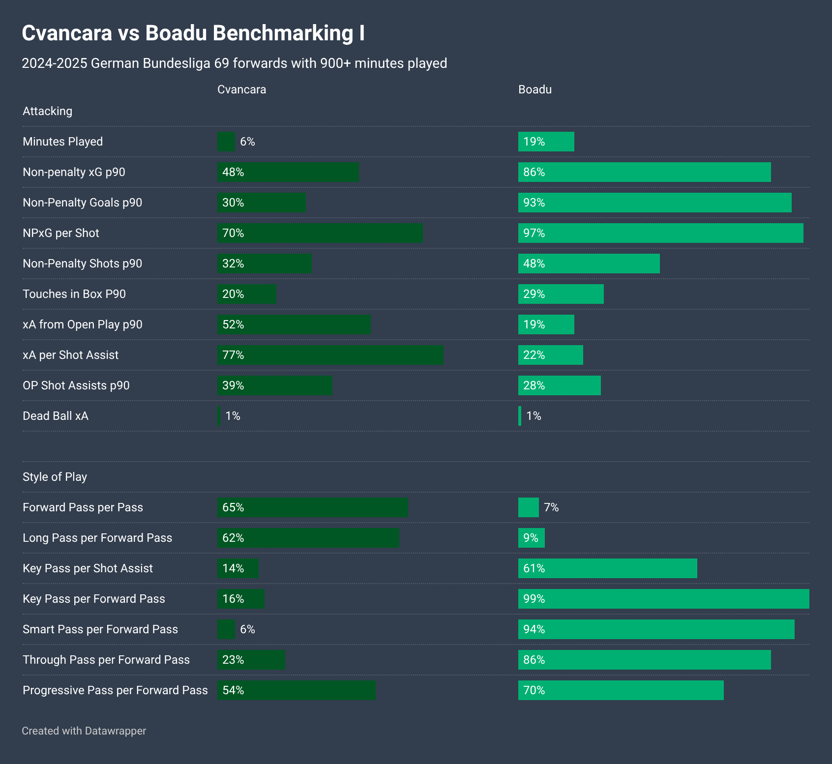 The first series of III graphics compares Tomas Cvancara to Myron Boadu, which may illicit some “who the hell is that?” Boadu is roughly the same age and similarly had a big move after a successful spell at AZ Alkmaar, going for €17 million to Monaco in August 2021. He’s been a relative journeyman since, with multiple loan moves prior to landing at PSV this past summer. Both forwards were used relatively lightly at their respective German Bundesliga sides for the 2024-2025 season.